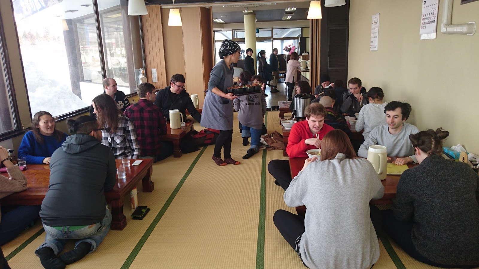 The sun was setting at this point, so we were herded back onto the bus and drove to our last destination of the day, a ski resort near Lake Inawashiro, the second biggest lake in Japan. That night we were given lodging and a meal. We also went to hang out in a nice onsen that had both indoor and outdoor pools. The outdoor pool had large chunks of daikon radish floating in the water. After that we hung out in some one’s room until after midnight socializing. But we went to bed before too long because we had a fun day ahead of us.